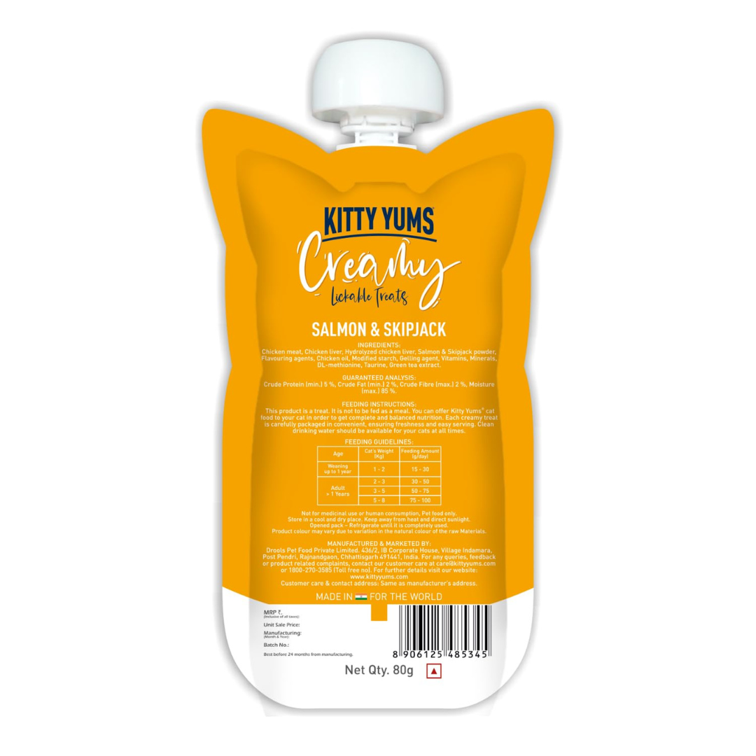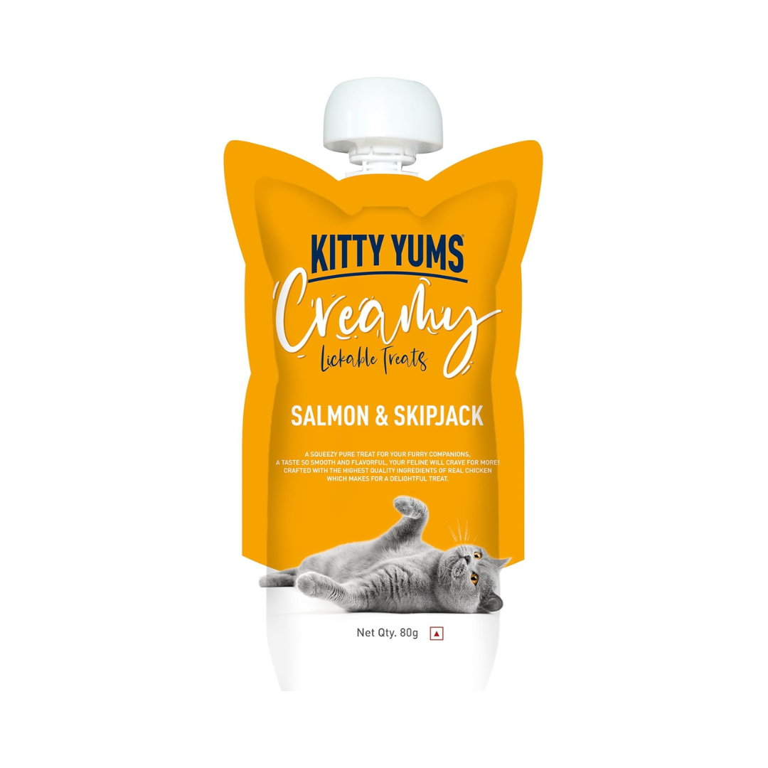 Give your feline friend a nourishing and delicious treat with Kitty Yums Salmon & Skipjack Creamy Cat Treats, ideal for rewarding and bonding moments.