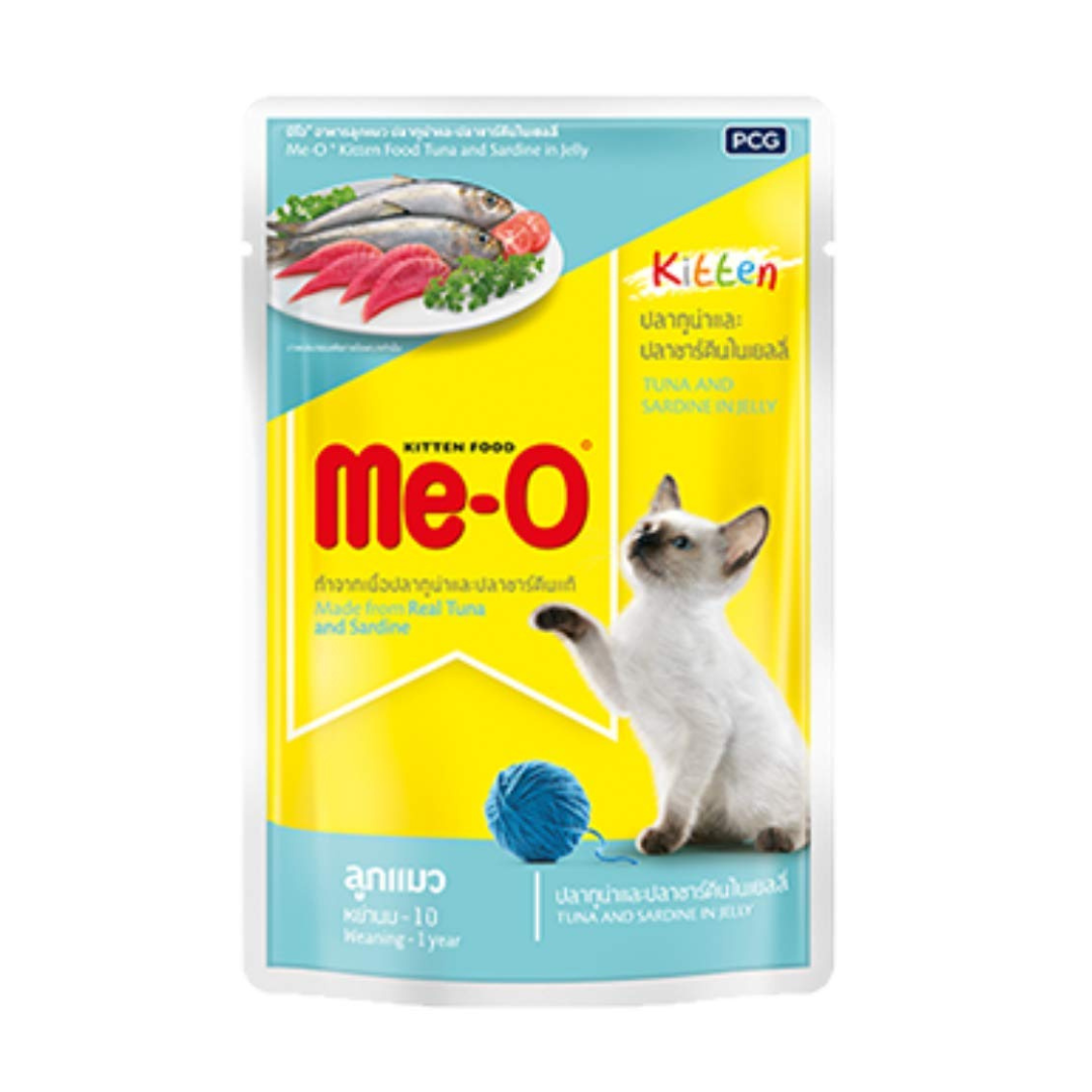 Me-O Kitten Tuna & Sardine in Jelly is a premium wet food specifically formulated for kittens of all breeds. Made with real tuna and sardine chunks in a flavorful jelly, this nutritious meal supports healthy growth, development, and overall vitality in your growing kitten.